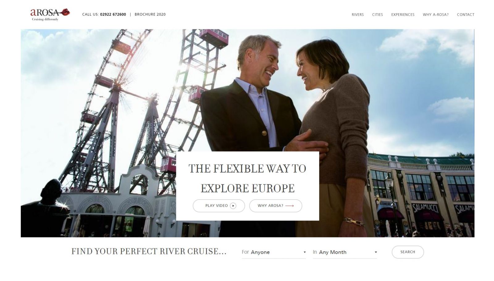 The website details all the destination and cruise information needed to sell A-ROSA cruises and it broken down into five sections: Rivers; Cities; Experiences; Why A-ROSA? and Contact Information.