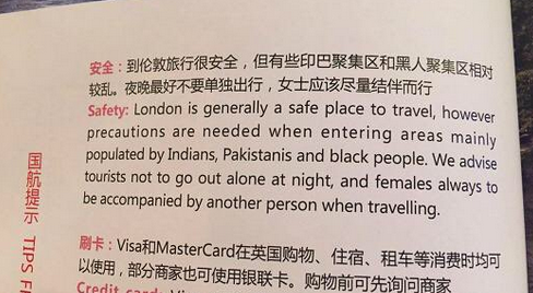 An article on the UK capital warned passengers to take precautions when visiting areas mainly populated by ‘Indians, Pakistanis and black people’.