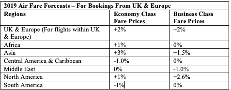 Air fares from the UK and Europe are expected to rise between 1% and 3% this year, according to a survey by American Express Global Business Travel (GBT)