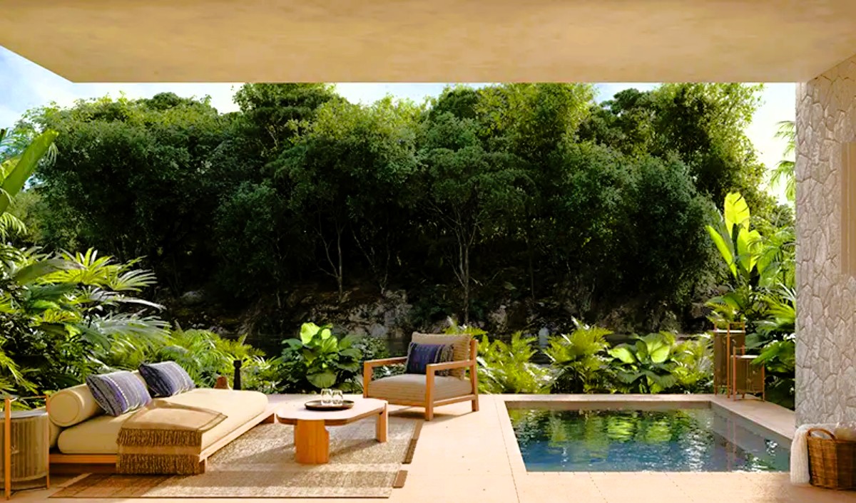 Nearly 40% of accommodations are suites, including a beachfront Presidential Suite. Interiors by Huber Design incorporate local materials such as tropical hardwoods and limestone, with furnishings created in collaboration with regional artisans. The overall aesthetic blends indoor and outdoor living, reflecting the textures and tones of the Yucatán Peninsula.