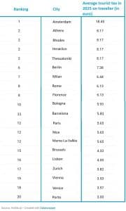 Italy makes its way in the top ten, with Milan leading among Italian cities. The city raised its maximum tourist tax to €7 per person, per night, for guests in 4- and 5-star hotels. The average rate now stands at €6.44. The increase is timed with the Jubilee Year and aims to fund public services and cultural preservation.