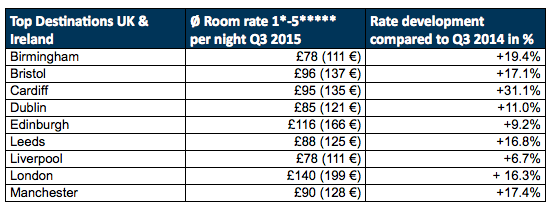 "In Cardiff, major sporting events such as the Rugby World Cup (RWC) and The Ashes which took place during Q3 2015, will have contributed to the room rate increases as hoteliers capitalise on the surge in demand from visitors," said Jon West, MD of HRS for the UK and Ireland.