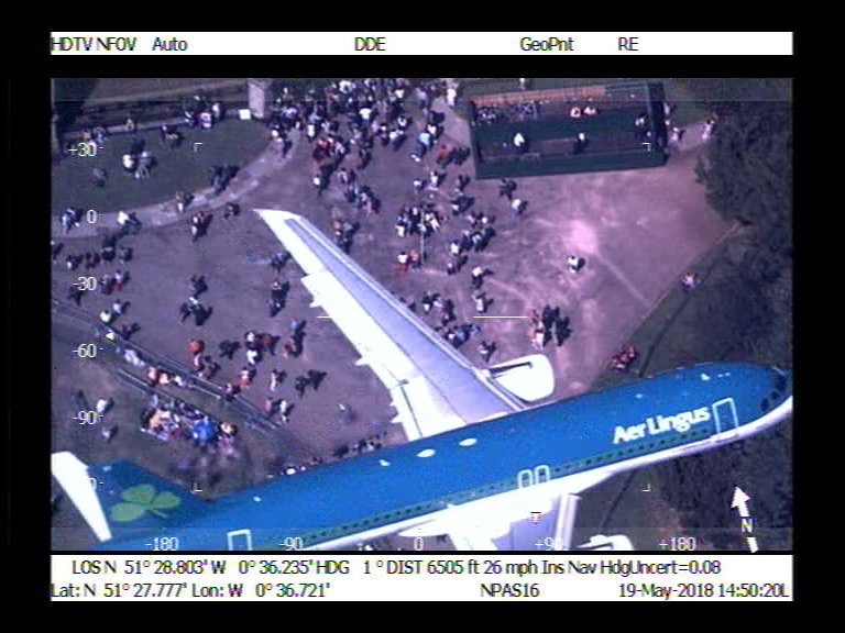 The UK’s National Police Air Service has tweeted images of the moment an Aer Lingus aircraft flew between its security helicopter and Royal Wedding crowds at Windsor on Saturday.