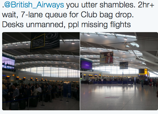 One frustrated passenger posted pictures of long queues and tweeted: "@British_Airways you utter shambles. 2hr+ wait, 7-lane queue for Club bag drop. Desks unmanned, ppl missing flights."