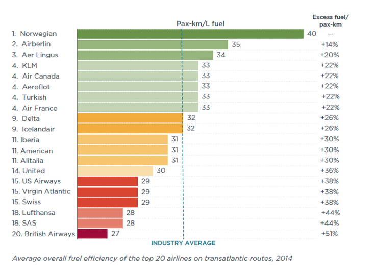 The study found the gap between the most and least fuel-efficient airlines on 2014 transatlantic operations was 51%.