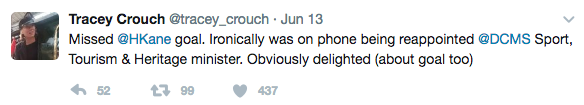 The Conservative MP for Chatham and Aylesford said she had received a call confirming the move during the England v France game and had missed a goal by Harry Kane.