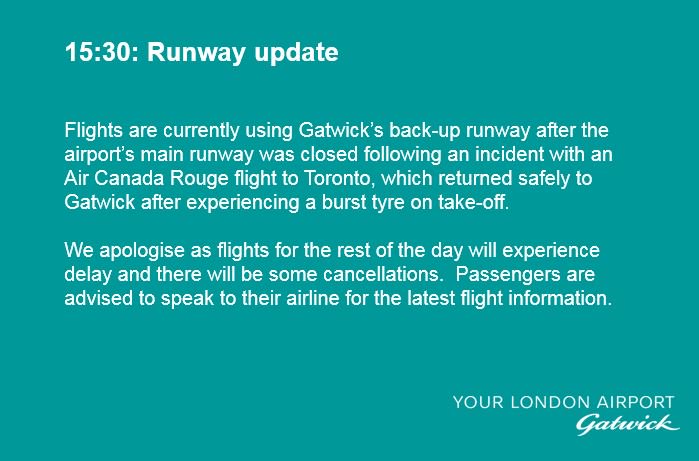 Gatwick issued an earlier statement saying: "An Air Canada Rouge flight to Toronto has returned to Gatwick after experiencing a burst tyre on take-off.