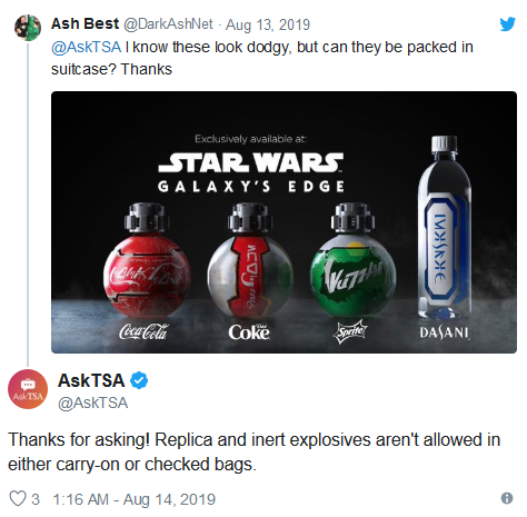 "Replica and inert explosives aren’t allowed in either carry-on or checked bags," the agency tweeted in response to an inquiry from a traveler.