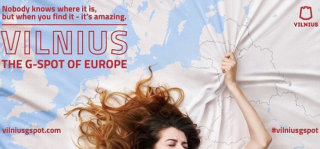 Posters, which will start to appear in London and Berlin today, feature a woman lying on a bed sheet printed with a map of Europe, with her hand gripping Lithuania. The text above her reads: "Vilnius, the G-spot of Europe. Nobody knows where it is, but when you find it, it’s amazing."