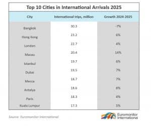 Bangkok retains its position as the world’s most visited city, with 30 million international arrivals, despite challenges including a stronger local currency, safety perceptions, and intensifying regional competition. Total arrivals dropped meanwhile by 7% compared to 2024.