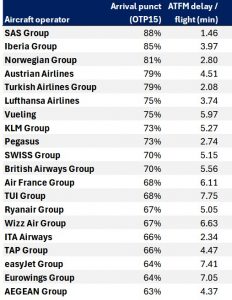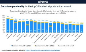But the record week was also marked by severe convective storms, which disrupted operations across large parts of the continent. Delays surged 31% compared to Week 34, pushing overall arrival punctuality down 2.8 points to 71%. Still, weather impacts were 3.1% lower than in Week 35 of 2024, signaling a stronger, more resilient network.