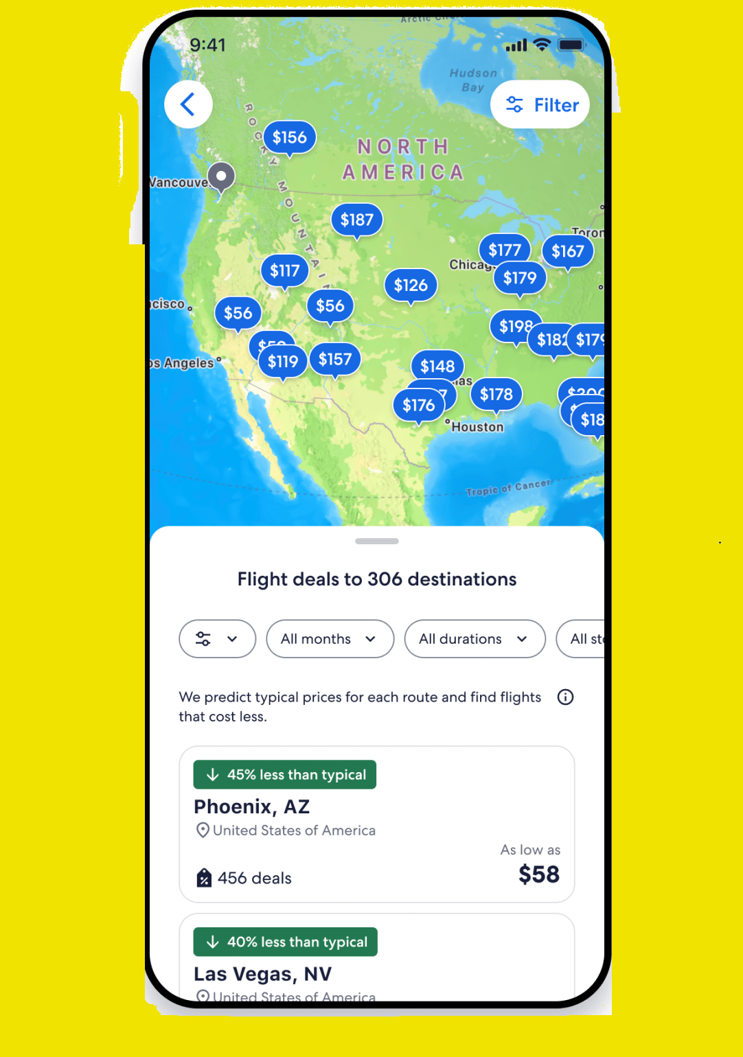The map discovery experience, available on iOS, includes filters to set trip duration and travel dates, along with the option to create custom notifications to stay updated when new deals appear, making it easier for travelers to discover new destinations.