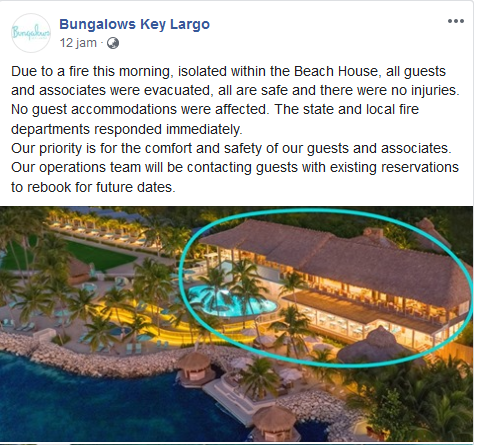 "Due to a fire this morning, isolated within the Beach House, all guests and associates were evacuated, all are safe and there were no injuries," Bungalows Key Largo said.