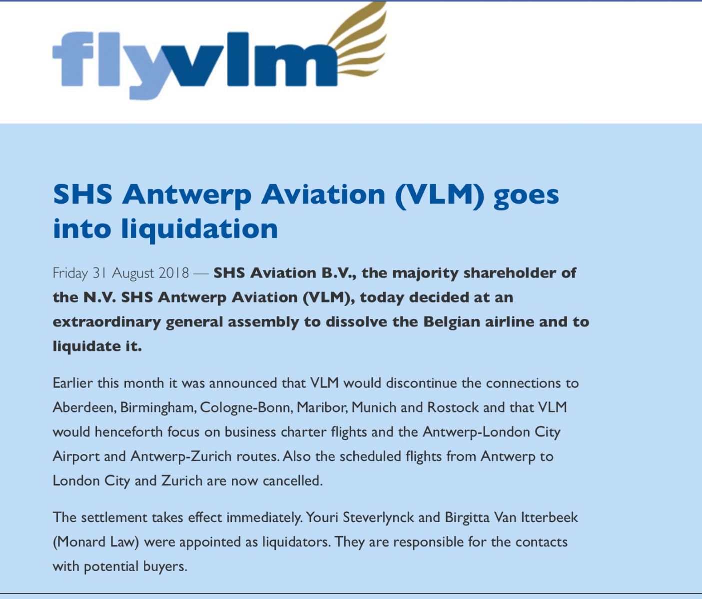 The CAA information says: "FLYVLM, a Belgian scheduled air carrier which operated services from various points in the United Kingdom, ceased operations on 31 August 2018.