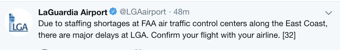 Flights are being severely delayed at La Guardia, Newark, Philadelphia and other airports as a result of the US government shutdown.