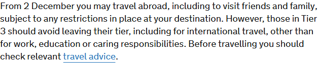 However, updated guidance published on the government’s website on Saturday says people in tier 3 should avoid international travel.