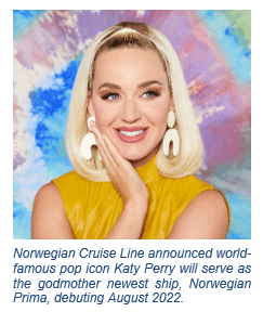 Pop diva and ‘American Idol’ judge Katy Perry will be godmother to Norwegian Cruise Line’s newest ship, Norwegian Prima, debuting August 2022.