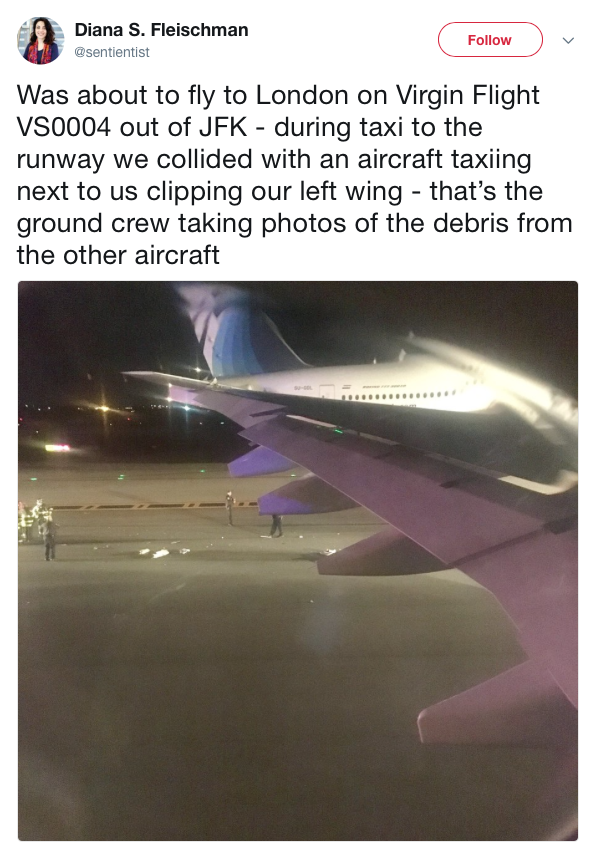 A spokesperson for Virgin Atlantic told the London Evening Standard: "Our VS4 flight from New York to London Heathrow sustained damage to the wingtip whilst taxing to the runway at JFK airport yesterday (27 November).