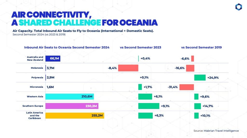 When comparing scheduled inbound and domestic air seats for the second half of 2024 with 2019 same period, data shows that only Polynesia is 25% above 2019 figures.