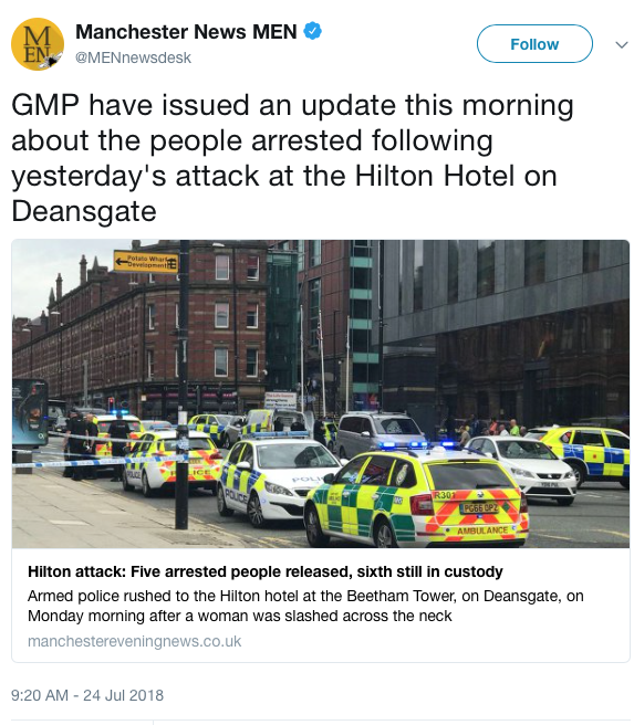 A spokesman for the Hilton Hotel, Deansgate, said: "We can confirm that a serious incident took place at the hotel.