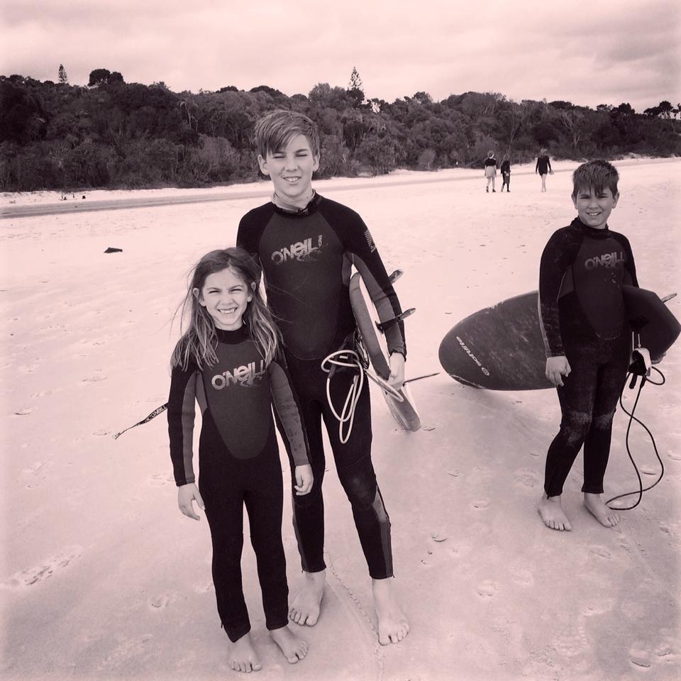 Jamie & Conor surfing at Byron Bay, with little sister Phoebe