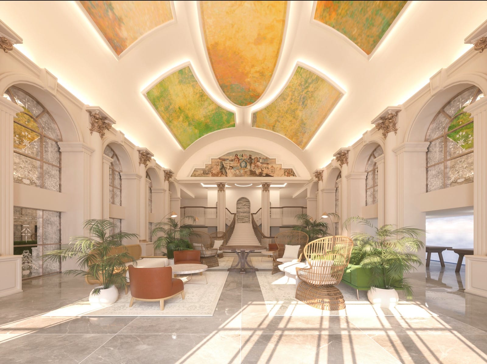 The British Colonial Nassau features Colonial Revival architecture and decor throughout, with towering chandeliers, original crown mouldings and colorful murals.