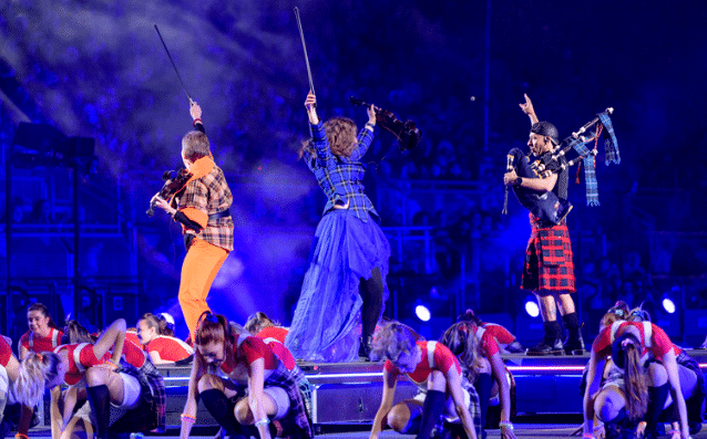Massed pipers and drummers are joined by traditional dancers and performers from around the world.
