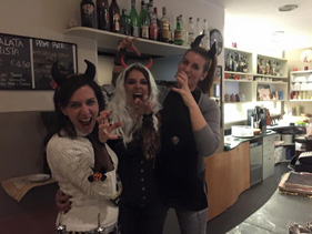 As you may imagine, a village that enjoys parties so much as Longiano has a whale of a time at Halloween. The ancient hilltop castellated village provided the perfect evening setting for a Halloween party – and simply everybody joined in. Old and very young got themselves up in costumes and joined in enthusiastically – dancing to a live loud band in the square and trick or treating, mainly focused on the café.