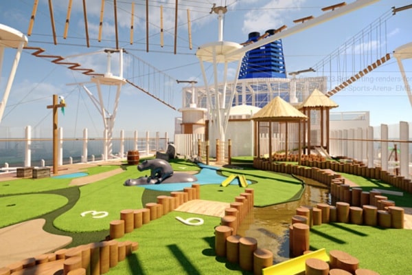Arvia showcases a top deck ‘Altitude’ experience with a high ropes course, tropical themed mini-golf and water splash zone.