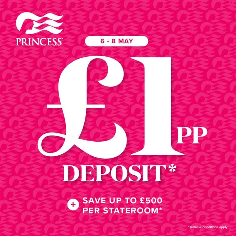 The £1 deposit deal can be combined with Princess’ current offer of savings up to £500 per stateroom on selected cruises.