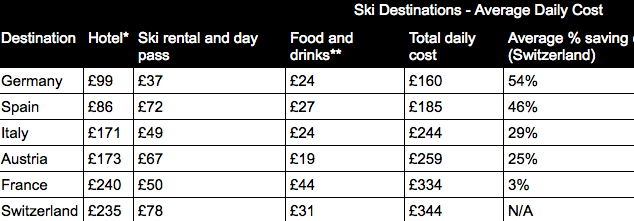 Switzerland is the most expensive, costing £344 a day, followed closely behind by France at £334 a day.