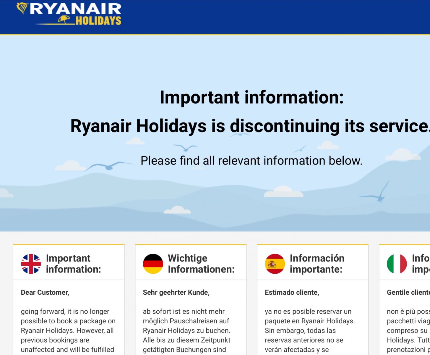 It adds: "Going forward, it is no longer possible to book a package on Ryanair Holidays. However, all previous bookings are unaffected and will be fulfilled as planned."