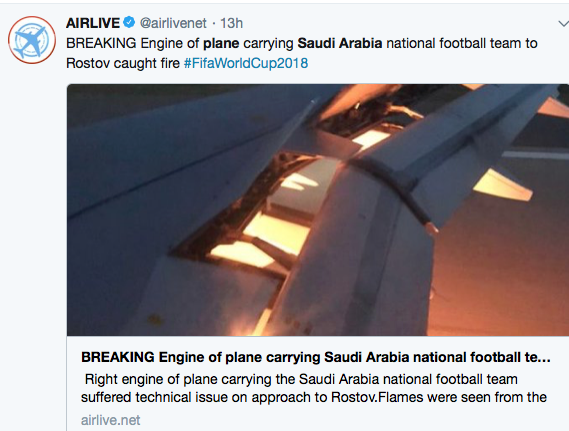 Saudi Arabian Football Federation president Ahmad Al Harbi said: "It was a small fire in one of the engines, the right engine, but the plane landed safely."