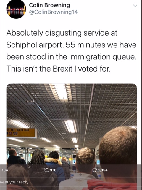 A tweet, by Brexiteer Colin Browning, showed a picture of a queue of passengers on Thursday, with the words: "Absolutely disgusting service at Schiphol airport. 55 minutes we have been stood in the immigration queue.This isn’t the Brexit I voted for."