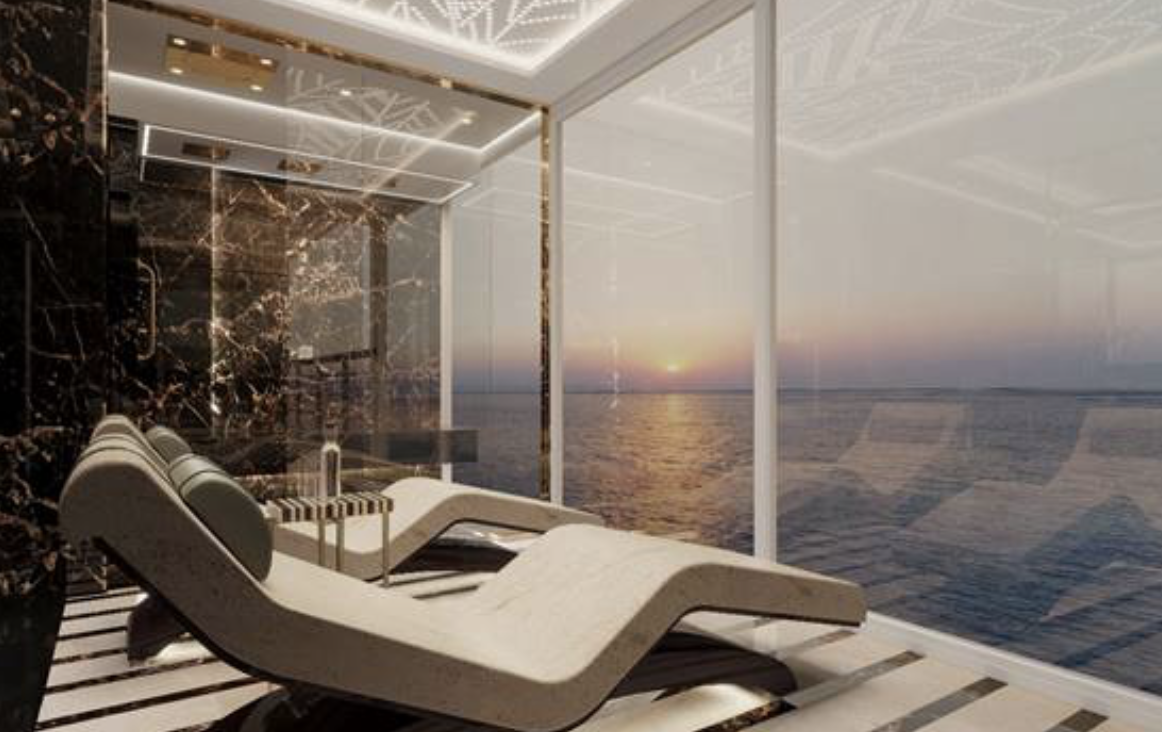 It also boasts unobstructed 270-degree views over the ship’s bow from a 1,300 square-foot wraparound veranda and a glass-enclosed solarium sitting area on top of the bridge for a Captain’s view.