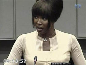 A frame grab shows British supermodel Naomi Campbell testifying at the war crimes trial of former Liberian President Charles Taylor at the U.N. Special Court for Sierra Leone in Leidschendam August 5, 2010. Credit: Reuters/Special Court for Sierra Leone