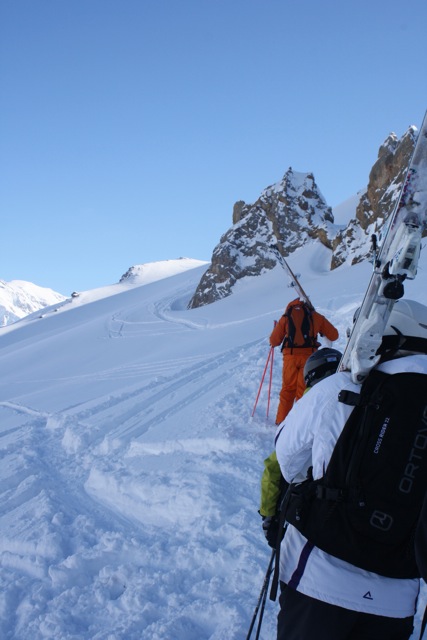 Les Avals starts with a 10 to 15-minute hike across a steep slope to a ridge, from where a long off-piste route leads back to Courchevel 1650. I found the hike in ski boots and carrying my skis over my shoulder pretty tough, but the view when we arrived on the ridge was worth it. All around us lay a blanket of pristine, virtually untouched snow, just waiting for us to dent it with our own tracks.