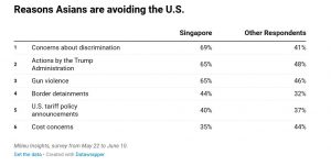 A growing number of Southeast Asian travelers say the United States is becoming a less attractive destination. Concerns are ranging from gun violence to discrimination outweighing cost issues for many. The trend reflects a global disaffection of travelers to the United States since the Trump administration came into power.