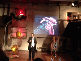 Koen Vanmechelen giving the keynote presentation in his surreal studio