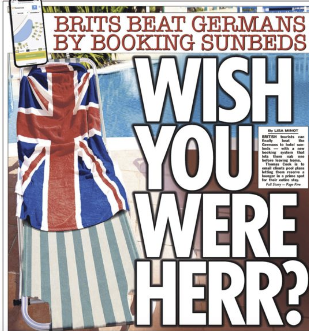 The Sun’s front page today reads: Wish you were herr? Victory as Brits can FINALLY beat German tourists to hotel beds with booking app.
