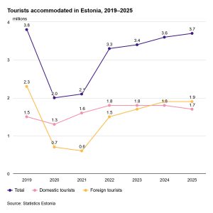 According to Statistics Estonia, accommodation establishments in Estonia hosted around 3.7 million tourists in 2025, marking a 2% increase compared to 2024, although still 3% below pre-pandemic 2019 levels. Compared with 2024, the number of international visitors increased, while domestic tourist numbers declined slightly.