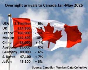Canada recorded its fourth consecutive monthly decline in May with total international overnight travelers down by 7% at 1.7 million. From January to May, total overnight arrivals reached 5.5 million, a decline of 6% according to the Canadian tourism data collective.