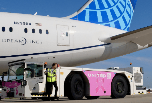 As part of Breast Cancer Awareness Month in October, United Airlines has unveiled a specially wrapped aircraft tug in pink, featuring the iconic breast cancer ribbon.
