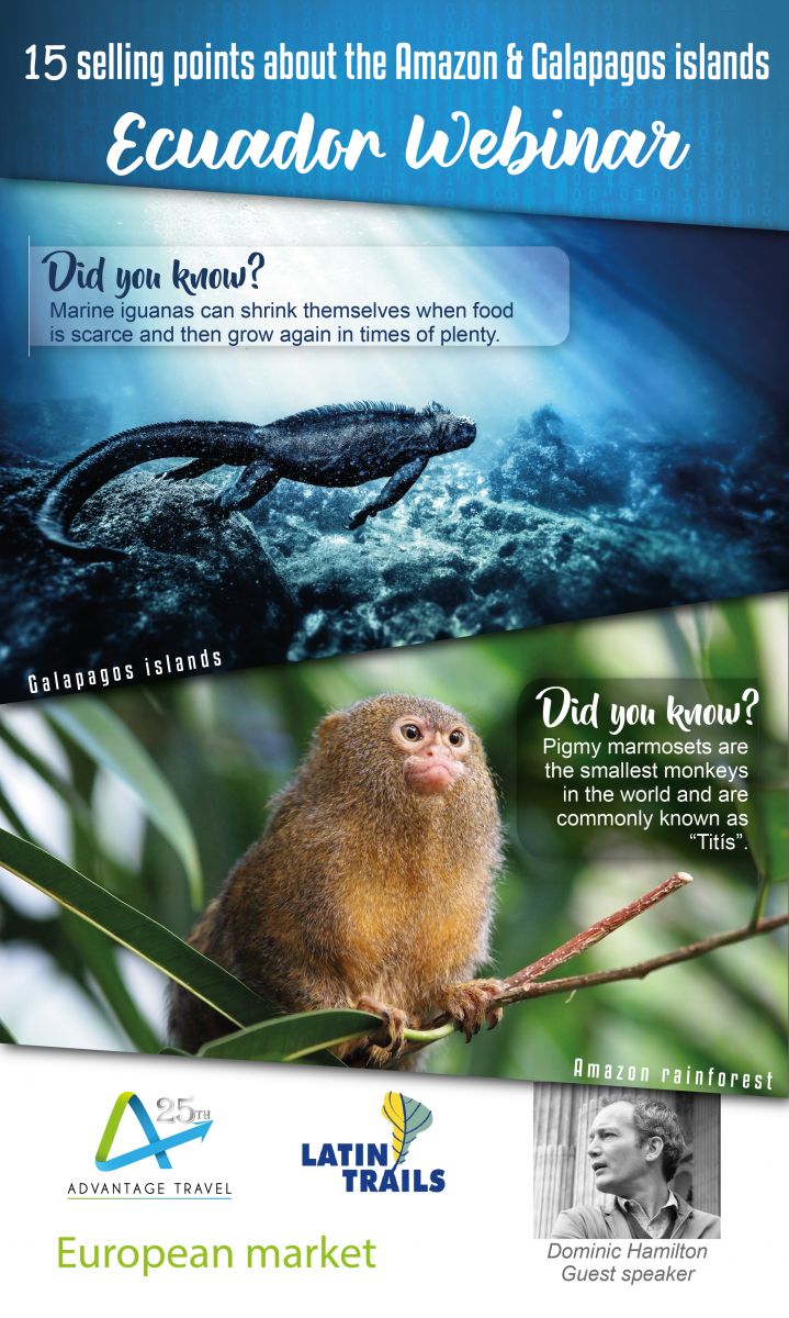That´s the main reason to prepare a webinar when Latin Trails and Advantage Travel, both specialists in the Galapagos Islands and the Ecuadorian Amazon respectively, are going to present the 15 facts to know to sell a combination of both destinations that every travel agent, tour operator or travel planner need.