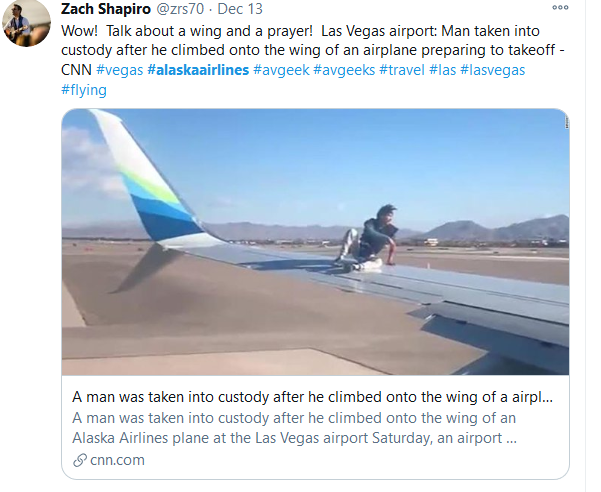 After some time surrounded by law enforcement trying to coax him down, he climbed the winglet and then fell to the tarmac.