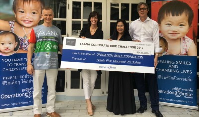 YAANA Ventures presented US$25000 to Operation Smile Thailand and Vietnam on 25 September in Bangkok. The donation was made possible by 20 energetic rider-sponsors who joined the inaugural YAANA Bike Challenge. The three-day 226 km bike ride took place 9-11 September along the scenic coast of central Vietnam, from Quy Nhon to Hoi An.
