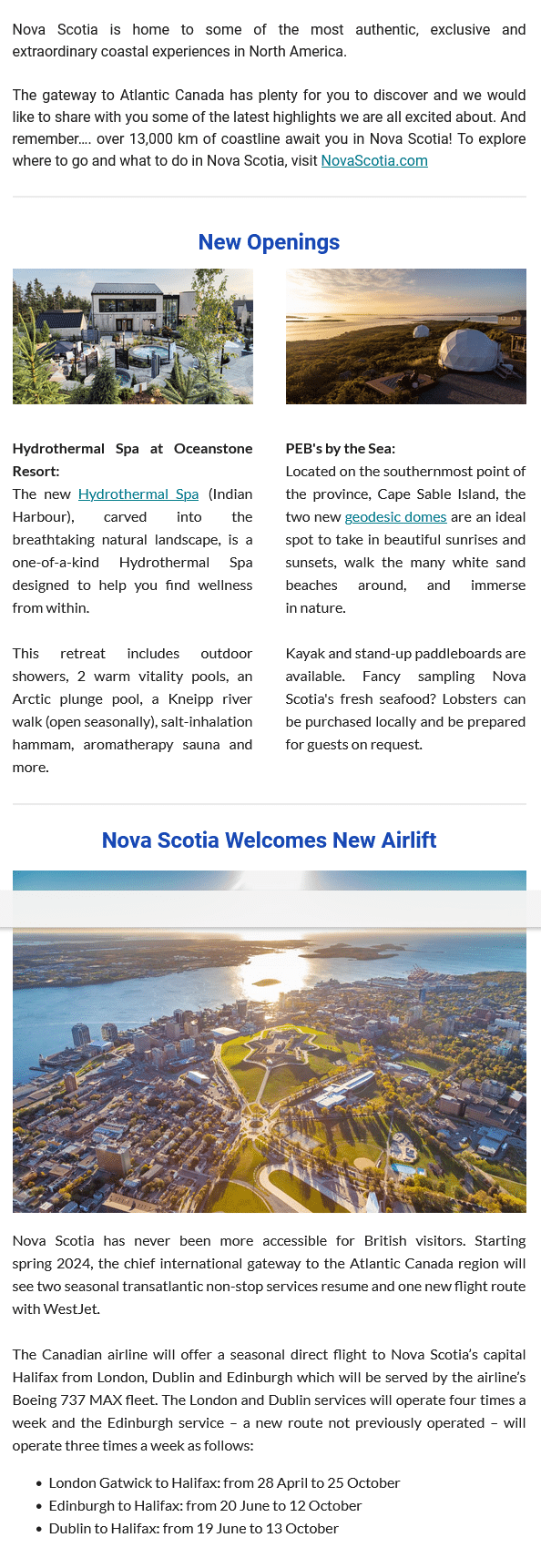 In addition to our holiday prize, Canadian Affair are also offering a cash incentive for bookings that include Nova Scotia. Agents can earn up to