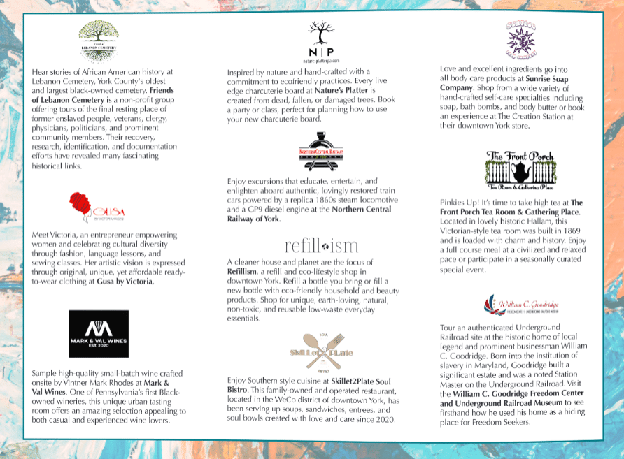 It is our goal to develop additional tours to complement the Women Owned or Operated and African American Focused trails, so please subscribe to receive our complimentary e-newsletter for updates on our complete TOURS and TRAILS series.