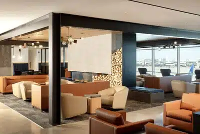 Influenced by the Colorado Rocky Mountains, travelers visiting the new club location on the western side of the A Concourse near gate A26 can experience a sense of place among locally-sourced furniture and decor that reflects Colorado’s outdoor landscapes and experiences. Designed to feel like a ski lodge, two fireplace lounges, stacked wood, flannel patterned cushions and vintage ski decor make travelers feel like they’re nestled deep in the woods on a Colorado retreat.