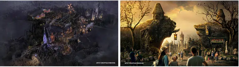 - Curse of the Werewolf – Deep in the woods that sit on the edge of Darkmoor, guests will find Curse of the Werewolf, a spinning family coaster inspired by “The Wolf Man.” Guests will enter the encampment of The Guild of Mystics where they’ll be greeted by the Maleva, the guild’s all-knowing seer and leader, who warns them that they bear the mark of the werewolf. Guests then board a wagon and venture into the forest – racing to escape the werewolves before they become one themselves.